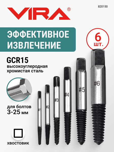 Экстракторы предназначены для извлечения сорванных или поврежденных иным образом резьбовых крепежных элементов (болтов, шпилек). Подходят для резьбы поврежденных винтов M3-M25. Экстракторы в наборе имеют квадратный хвостовик. Материал- высокоуглеродная хромовая сталь GCR15; Экстракторы для болтов VIRA используются для выкручивания сломанного тела болта. Набор поставляется в удобном для хранения кейсе.