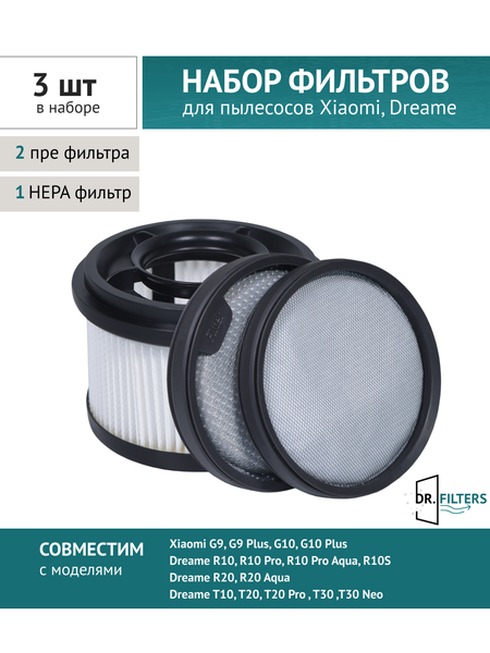 Во время работы пылесоса некоторое количество пыли попадает обратно в помещение, как правило, это самые мелкие частицы. Снизить уровень загрязнения воздуха помогут специальные фильтры, которые задерживают даже незначительные пылинки. Фильтры обеспечивают эффективную очистку воздуха, значительно уменьшая попадание пыли, пыльцы, продуктов жизнедеятельности домашних животных и других аллергенов в воздух, которым вы дышите.⠀ В качестве такого фильтра используется фильтр высокоэффективной очистки HEPA. Фильтр изготовлен из высококачественных материалов. Рекомендации: чтобы ваш пылесос работал на максимальной производительности, фильтры должны промываться один раз в месяц и меняться каждые 2 - 3 месяца. Совместимость с моделями: Xiaomi Dreame T10 /T20 / T20 Pro / T30 /T30 Neo Xiaomi Mi Handheld Vacuum Cleaner G9 / G9 Plus / G10 Dreame R10/ R10Pro / R20 Размеры: HEPA фильтр Ø95 мм, H 65 мм, отверстие Ø43 мм Мембранный фильтр Ø86 мм, H 10 ммВо время работы пылесоса некоторое количество пыли попадает обратно в помещение, как правило, это самые мелкие частицы. Снизить уровень загрязнения воздуха помогут специальные фильтры, которые задерживают даже незначительные пылинки. Фильтры обеспечивают эффективную очистку воздуха, значительно уменьшая попадание пыли, пыльцы, продуктов жизнедеятельности домашних животных и других аллергенов в воздух, которым вы дышите.⠀ В качестве такого фильтра используется фильтр высокоэффективной очистки HEPA. Фильтр изготовлен из высококачественных материалов. Рекомендации: чтобы ваш пылесос работал на максимальной производительности, фильтры должны промываться один раз в месяц и меняться каждые 2 - 3 месяца. Совместимость с моделями: Xiaomi G9 (BHR4368GL) Xiaomi G9 Plus (BHR6185EU) Xiaomi G10 (BHR4307GL) Xiaomi G10 Plus (BHR6179EU) Dreame R10 (VTV22B) Dreame R10 Pro (VTV41B) Dreame R10 Pro Aqua (VZV15A) Dreame R10S (VZV22A) Dreame R20 (VTV97A) Dreame R20 Aqua (VTV21A) Dreame T10 (VTN1) Dreame T20 (VTE1) Dreame T20 Pro (VTE1-GR3) Dreame T30 (VTT1) Dreame T30 Neo (VTE3) Размеры: HEPA фильтр Ø95 мм, H 65 мм, отверстие Ø43 мм Мембранный фильтр Ø86 мм, H 10 мм