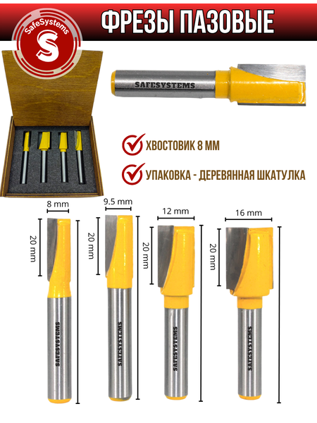 1. Пазовая прямая фреза 16 мм 2. Пазовая прямая фреза 12 мм 3. Пазовая прямая фреза 9.5 мм 4. Пазовая прямая фреза 8 мм