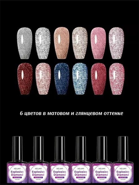 Набор гель-лаков 6 популярных оттенков Представляем вашему вниманию набор гель-лаков Karvel, состоящий из 6 самых популярных оттенков светоотрающей линейки лаков объемом 8 мл каждый. Гель-лаки отличаются высокой пигментацией и долгим сохранением насыщенности цвета. Благодаря эффекту самовыравнивания и плотной консистенции, маникюр с гель-лаками сохраняет стойкость до 4х недель. Входящие в набор гель-лаки обладают глянцевым эффектом и красивым блеском, который усиливается при определенном освещении. Для создания уникального маникюра вы можете использовать подложку из черного, белого или прозрачного гель-лака, а также нюдовых оттенков. Технология нанесения гель-лаков проста и удобна: подготовьте ногтевую пластину, нанесите базу для гель-лака, высушите в LED-лампе, нанесите цветной слой гель-лака, полимеризуйте в лампе, нанесите топовое покрытие и снова высушите в лампе. Выбирая набор гель-лаков Karvel, вы получаете 6 ярких и насыщенных оттенков, которые станут уникальным украшением ваших рук и подарят чудесное настроение.