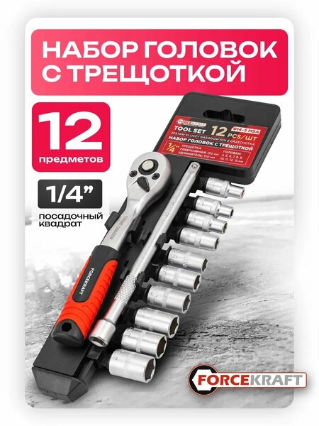 Набор головок с трещоткой ForceKraft 12 предметов — это профессиональный инструментальный комплект, разработанный для выполнения различных ремонтных и монтажных работ. Посадочный квадрат: 1/4 дюйма (подходит для точной и аккуратной работы). Материал инструментов: Головки изготовлены из хромванадиевой Cr-V, что обеспечивает повышенную прочность и стойкость к износу стали. Трещотка оснащена реверсивным механизмом для удобного закручивания и откручивания крепежа. Дизайн ручки: Антипротивоскользящие ручки обеспечивают комфортную работу даже при длительном использовании. Реверсивная трещотка 150 мм, позволяет быстро закручивать и откручивать болты и гайки. Головки 6-гр: 4, 5, 6, 7, 8, 9, 10, 11, 12, 13 мм. Подходят для работы с различными типами крепежа. Удлинитель: 150 мм, для труднодоступных мест. Универсальность: подходит как для домашнего использования, так и для профессиональных задач. Автомобильный ремонт: Замена колёс, фильтров, свечей зажигания, регулировка подвески и другие работы. Строительство и ремонт: Сборка мебели, установка техники, ремонт бытовой техники. Профессиональное использование: Обслуживание промышленного оборудования, сборка конструкций и другие технические задачи. Набор головок с трещоткой ForceKraft (12 предметов) — это незаменимый помощник для любого мастера или автолюбителя. Его универсальность, качество исполнения и компактность отличный выбор для решения любых задач по ремонту и обслуживанию. Этот набор инструментов FORCEKRAFT — отличный подарок для любого автолюбителя или мастера своего дела. Подарите этот комплект на 23 февраля или День Рождения, и он станет надежным помощником для вашего папы, мужа или другого особенного мужчины в вашей жизни.