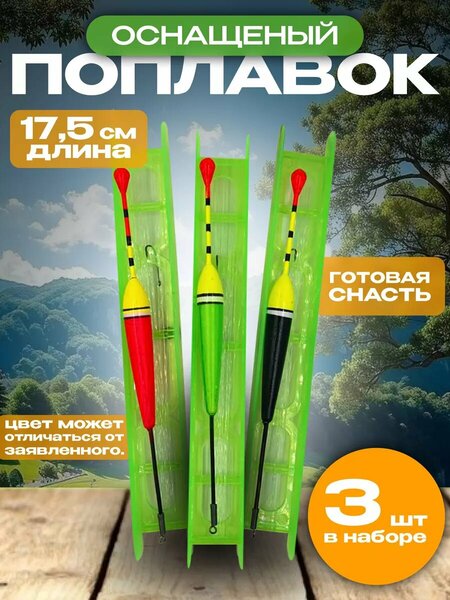 Оснастка готовая поплавочная 3шт. Набор готовых поплавочных оснасток для рыбалки, содержит в себе: поплавок, крючок, леска, груз для маховой удочки. Оснастка для рыбалки на поплавочную удочку полностью готова к использованию. Все что необходимо - это не оснащённое удилище. Оснастка крепится к кончику удилища и готова к использованию. Поплавки изготовленны из высококачественного материала, в силу этого - долговочны и износостойки в использовании. Изготовлены из вспененного полиуретана! Позволяет сохранить точный баланс даже при небольших колебаниях воды! Вспененный полиуретан не впитывает воду, гарантируя долгий срок службы товара. Подходят для большинства типов удилищ!