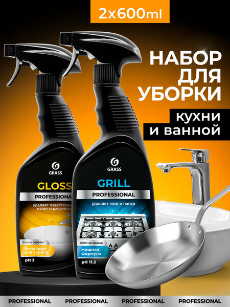 Вместе выгодней! Набор средств для уборки дома от Grass, 2 предмета. 1) Чистящее средство для кухни Grill Professional 600мл - профессиональное высокоэффективное средство, предназначенное для очистки кухонных плит, фритюрниц, жарочного оборудования, посуды, грилей, духовки от стойких пищевых и органических загрязнений: нагара, жира, копоти и пригоревшей пищи. Антижир Гриль эффективно работает на эмалированных поверхностях, изделиях из стекла, нержавеющей стали, чугуна, хрома, фаянса, фарфора. Средство содержит активные чистящие компоненты, расщепляющие жир, нагар и другие органические загрязнения. 2) Gloss Антиналёт 600мл - универсальное средство, подходит чистки раковины, унитаза, душевых кабин, ванной, туалета, плитки и многого другого. Глосс эффективен против известкового налета, пятен, ржавчины, мыльных разводов, накипи и солевых отложений на различных поверхностях. Безопасен для стеклокерамических, металлических, акриловых поверхностей, а также раковин из нержавеющей стали. Не содержит хлора и щелочных веществ. За счёт наличия триггера на флаконах - удобны в применении, помогут вам точечно наносить средство на место загрязнения. Бытовая химия GRASS - это незаменимые помощники в деле любой уборки. Мы рекомендуем выбирать качественные моющие и чистящие средства, а также товары для уборки от Официального магазина Грасс, заботясь о вашем здоровье и окружающей среде!