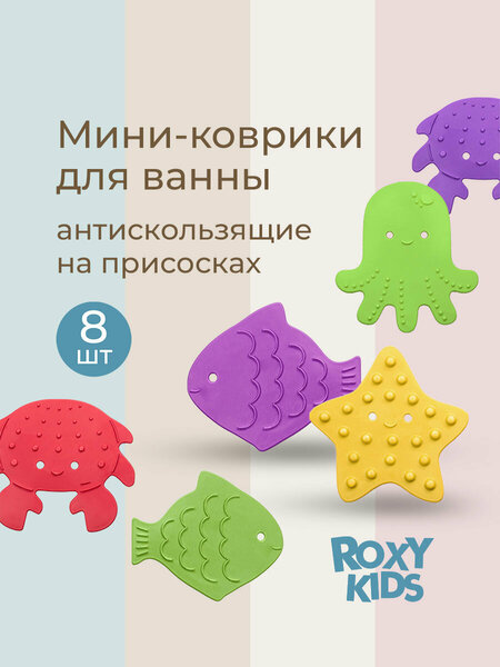 Антискользящие мини-коврики от ROXY-KIDS- первые многофункциональные мини-коврики, произведенные в России из абсолютно безопасных материалов. Особенность этих малышей в виде морских животных в том, что им действительно можно найти множество применений: - антискользящая поверхность для купания: отличная замена большому коврику, который неудобно промывать и сушить; - массажер: рельефная поверхность (маленькие точки, зигзаги, большие пупырышки) обеспечивает бережный массаж стоп и ладоней; - грызунок: мини-коврики произведены из термоэластопласта – материала современных прорезывателей, поэтому вы без опаски можете позволить малышу тянуть их в рот; - развивашка: мало того, что это тренажер для развития мелкой моторики и хватательных рефлексов, с мини-ковриками от ROXY-KIDS ваш малыш познакомится с названиями морских обитателей (в комлекте рыбка, осьминог, краб и морская звезда) и выучит основные цвета; - украшение интерьера: налепите коврики на дно и стенки ванны, на кафель или даже на пол, чтобы не только обеспечить удобство, но и расставить яркие цветовые акценты! Кроме того, эти мини-коврики абсолютно не пахнут, ведь не содержат ПВХ. Они просты в уходе: достаточно просто периодически промывать их с мылом, полоскать и сушить. Они легко и надежно крепятся с помощью присосок на любую гладкую поверхность, при этом не оставляют следов. С таким аксессуаром для ванной веселое, полезное и безопасное купание обеспечено вашему малышу!