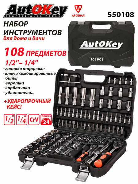 Бюджетная серия наборов инструмента AutOkey предназначена для бытового использования. Если вы редко занимаетесь ремонтом, а инструмента нет и не видите смысла тратиться на дорогие наборы - отличное решение: Набор AutOKey. В состав набора входят: - трещетки 1/2" и 1/4" - карданчики 1/2" и 1/4" - вороток шарнирный 1/4" - воротки Т-образные 1/2" и 1/4" - удлинители 1/2": 125 и 200 мм - удлинители 1/4": 50 и 100 мм - гибкий удлинитель 1/4" 65 мм - головки свечные 1/2": 16 и 21 мм - головки с битой (SL4, SL5.5, SL6.5, Т8, Т10, Т15, Т20, Т25, Т27, Т30, Н3, Н4, Н5, Н6, РН1, РН2, PZ1, PZ2) - биты (SL8, SL10, SL12, Т40, Т45, Т50, Т55, Т60, Н7, Н8, Н10, Н12, Н14, РН3, РН4, PZ3, PZ4) - переходник для бит 1/2" х 8 мм - ключи шестигранные Г-образные (1.5, 2.5, 3 мм) - головки торцевые 1/4" (4, 4.5, 5, 5.5, 6, 7, 8, 9, 10, 11, 12, 13, 14 мм) - головки торцевые 1/2" (10, 11, 12, 13, 14, 15, 16, 17, 18, 19, 20, 21, 22, 24, 27, 30, 32) - головки торцевые 1/4” тип Е: Е4, Е5, Е6, Е7, Е8 - головки торцевые 1/2” тип Е: Е10, Е11, Е12, Е14, Е16, Е18, Е20, Е24 - головки торцевые глубокие 1/4" (6, 7, 8, 9, 10, 11, 12, 13 мм)