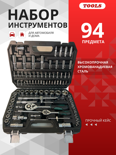 Набор инструментов Tools - это высококачественный и надежный комплект, состоящий из 94 предметов. Он предназначен для использования в автомобиле, дома, на даче и в других слесарных работах. Инструменты изготовлены из хромованадиевой стали, что обеспечивает их высокую стойкость к усталостным и ударным нагрузкам. Это гарантирует долгий срок службы и сохранение своих свойств даже при интенсивной эксплуатации. Набор упакован в ударопрочный пластиковый кейс с ручками, который удобно хранить в машине, гараже или дома. Кейс обеспечивает надежную защиту инструментов от повреждений и позволяет легко транспортировать их. Прорезиненное покрытие ручек обеспечивает удобный хват и максимальный комфорт во время использования. Твёрдость комплектующих набора инструментов составляет 44-48 HRC по шкале Роквела. В комплекте вы найдете ключи и трещотки, которые можно использовать как для самостоятельного обслуживания авто любых марок и производителей, так и для профессионального на СТО и в мастерских. Набор инструментов Tools станет отличным подарком для любого мужчины на любой праздник, будь то 23 февраля, день автомобилиста, день рождения или просто без повода.