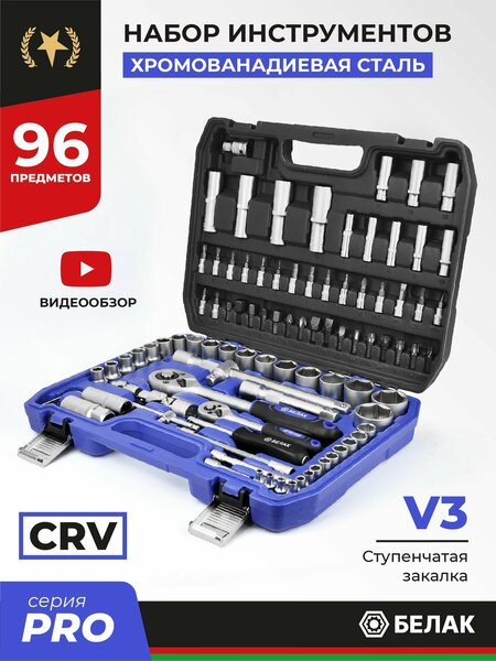 Набор ключей для автомобиля серии "PRO" разработан производителем БелАК, награжденным девятью национальными премиями "Автокомпонент года". Универсальный набор ключей с трещоткой предназначен для работ дома, на даче, в автомастерской, для гаража. Набор 96 предметов автомобильный для ремонта выполнен из специальной закаленной стали с повышенным содержанием углерода, с помощью ступенчатой закалки V3. Прочные металлические замки и эргономичный ударопрочный кейс чемодан, делают набор головок с трещоткой эффективным и мобильным. Высокое качество всех элементов набора для автомобиля порадует автомобилиста любого стажа и квалификации, а универсальность комплектации позволит использовать набор как инструменты для дома, машины и других видов ремонта. Набор торцевых головок, бит, ключей имеет высокие показатели твердости , что говорит о долгом сроке службы и устойчивости к сильным нагрузкам, за счет чего, данный комплект можно использовать как профессиональный инструмент для автосервиса. Наборы инструментов БелАК - хороший подарок в машину себе, мужчине, мужу, брату, папе, сыну, дедушке, автолюбителю, механику, слесарю, любимому. Подарочный набор для машины, автомобиля это отличный выбор, для того чтобы сделать приятно близкому человеку на день рождение, новый год, 23 февраля, 14 февраля, 8 марта, рождество. Приобретая продукцию БелАК, вы получаете качественные аксессуары и инструменты для авто. Гарантия не распространяется на повреждения вызванные: естественным износом, несчастным случаем, неправильным использованием или неправильной установкой. Гарантийные обязательства не распространяются на изделия со следами внесения любых конструктивных изменений ( включая сборку/разборку) и изделия имеющие механические повреждения, за исключением повреждений, явившихся следствием дефекта конструкции устройства.