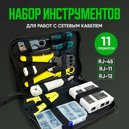 Набор инструментов для работ с витой парой и сетевым кабелем: LAN тестер, стриппер, кримпер, отвертки, обжимка RG45, RG11