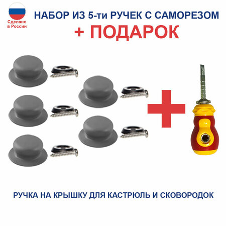 Если на вашей крышке сломалась ручка, то ее с легкостью можно заменить. Ручка для крышки с саморезом станет надежной заменой сломавшемуся устройству, она надежно закручивается и не разбалтывается в процессе эксплуатации. Изделие подойдет для любых крышек, в том числе из жаропрочного стекла. В комплекте корпус, саморез и прокладка. Изготовлено из пластмассы и нержавеющей стали. Технические характеристики: Тип: Ручка для крышки. Материал: Пластмасса, нержавеющая сталь. Страна изготовитель: Россия. Комплект ручек 5 шт пластиковые подойдут для любых крышек в том числе из жаропрочного стекла. Ручки для кастрюли, для сковороды, для сотейника. В комплекте корпус, саморез и прокладка. Изготовлено из пластмассы (полипропилен) и металла. Отвертка в подарок. Обращаем Ваше внимание, что цена указана за 5 шт ручек + подарок