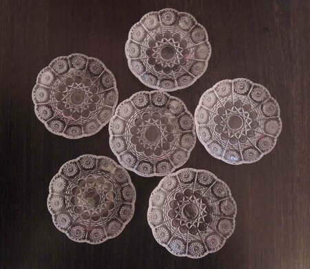 Набор состоит из 6-ти блюдец. Блюдца изготовлены из высококачественного стекла, отличающегося особой прочностью и долговечностью. Привлекательная форма и роскошный блеск делают блюдца неповторимыми и уникальными. Блюдце используют для того, чтобы пролитая из чашки жидкость никуда не проливалась, а оставалась на нём. Также из блюдец иногда пьют горячие напитки, в основном чай, быстрее остывающий за счет увеличения площади испарения. Кроме того, блюдца могут быть использованы для подачи к столу пирожных или порционных кусков торта/пирога, то есть как разновидность десертной тарелки. Набор блюдец Kai Da glass (6 шт.) Высота - 2 см Глубина - 1.5 см Диаметр 11.5