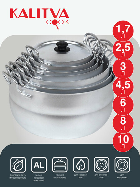 Набор кастрюль Матрешка из 7 предметов разного диаметра это отличный выбор для быстрого и практичного обустройства кухни в квартире или на даче. Варите супы, детские каши, компоты, соусы, глазури и яйца к завтраку, выбирайте оптимальный размер кастрюли под конкретный случай в будни и праздники. Пищевой алюминий абсолютно безопасен при нагревании, не содержит вредных примесей, не ограничен по сроку эксплуатации. Готовьте разнообразные блюда в любых объемах и не беспокойтесь о грязной посуде: матовый алюминий без покрытия очень легко моется, не требователен к составу чистящих средств и устойчив к истиранию. Максимальная компактность при хранении еще одно важное преимущество набора . 7 предметов (1,7; 2,5; 3,0; 4,5; 6,0; 8,0; 10,0 л.), 2 ручки, металлическая крышка. Наличие мелких царапин и небольших потертостей на поверхности алюминиевой посуды не влияют на свойства пищевого алюминия и долговечность посуды. Алюминий - это металл, который по химическим свойствам при эксплуатации в жёсткой воде с большим количеством солей темнеет. Поэтому, в первую очередь всё очень сильно зависит от региона проживания и химического состава водопроводной воды. В связи с этим использование алюминиевой посуды запрещается и при приготовлении и хранения кислот, щелочей и продуктов, содержащих данные вещества (маринадов, рассолов и др.) Если в процессе эксплуатации внутренняя поверхность посуды всё-таки потемнела, - не беда! Это всего лишь, выражаясь научным языком, оксидная плёнка, которая появляется вследствие окислительных процессов. Для осветления следует прокипятить в посуде в течение 10 минут воду с добавлением пищевой лимонной кислоты по ГОСТ 908-2004 из расчета 5г (0,5 чайной ложки) на 1 литр воды. Для удаления лимонной кислоты изделие необходимо тщательно промыть водой. Вся посуда ТМ Калитва для приготовления пищи может быть использована как на газовых, так и на электрических (чугунных и стеклокерамических) варочных панелях.