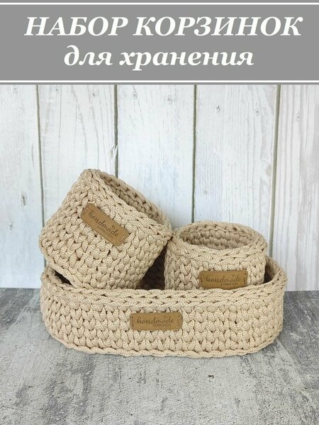 Красивый набор из трёх вязаных корзин, которые можно использовать для организации пространства абсолютно везде! Такой набор идеально подойдет для организации пространства в ванной комнате или на туалетном столике. В двух маленьких корзинках можно хранить ватные диски и ватные палочки, а в корзине побольше, легко поместятся более крупные предметы – расчески, кремы, косметика и прочие аксессуары. Корзины связаны вручную из полиэфирного шнура, благодаря плотной вязке отлично держат форму. Деревянное дно придает дополнительную устойчивость. Выполненные в едином стиле, корзины станут отличным дополнением к любому интерьеру! Набор вязаных корзин станет прекрасным подарком для тех, кто предпочитает красивые, стильные, но в то же время - утилитарные вещи! В набор входит три корзины: 2 шт. круглые 9х9х8 см. и овальная 21х12х6 см. (допустимо отклонение в размерах +-0,5 см, так как это ручная работа.) Уход: избегать контакта с водой, рекомендована сухая чистка.