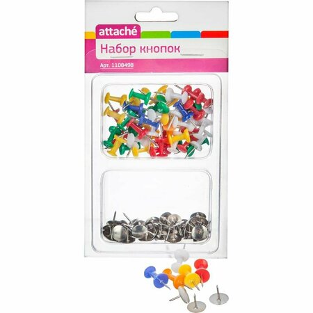 Набор кнопок Attache состоит из канцелярских кнопок и кнопок для пробковых досок, каждых по 50 штук. Канцелярские кнопки серебристого цвета с металлической шляпкой диаметром 9,5 мм и металлической игольчатой ножкой. Кнопки для пробковых досок с цветной пластиковой шляпкой диаметром 8 мм и металлической игольчатой ножкой. Кнопки предназначены для крепления бумаги и фотографий к различным поверхностям. Набор поставляется в блистерной упаковке с картонным подвесом.