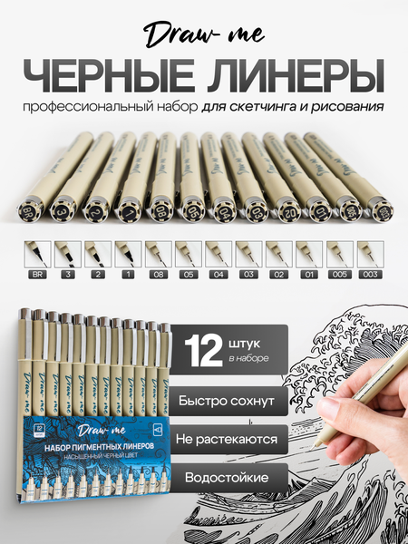 Набор капиллярных ручек, линеров, кистей для рисования, каллиграфии, дотворка и черчения, ручки линеры разных размеров, 12 штук - 1 набор