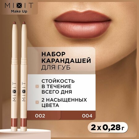 Миксит Подарочный набор для макияжа лица Make Up. В бьюти бокс входит стойкий матовый карандаш для губ Longwearing lip pencil. Продукт представлен в двух нюдовых оттенках: 002 – First kiss холодный розовый нюд. Нежно вишневый розовокоричневый оттенок. 004 – Savage Rose темно-розовый с коричневым подтоном. Красный, бордовый, винный оттенок. Автоматический выкручивающийся карандаш зрительно увеличивает губы и подчеркивает красоту вашего лица. Благодаря мягкой гелевой текстуре карандаш дает яркий цвет одним касанием, легко ложится и не ощущается на губах. Обеспечивает равномерное и стойкое покрытие в течение всего дня: не растекается и не сушит губы. Выдвижной водостойкий карандаш как подводка лайнер создает тонкий контур и красиво выделяет форму губ. Способ применения: прорисовать контур губ карандашом. Средство может быть использовано в виде базы под губную помаду или блеск, а также вместо помадки на всю поверхность губ. Чтобы скорректировать макияж и создать более четкий контур, используйте корректор на зону вокруг губ. Результат: увеличение объема, стойкий и насыщенный цвет, контуринг губ, идеальный макияж. Professional beauty box подходит для всех оттенков кожи от темных до светлых. Контурный карандаш представлен в четырех цветах. Также попробуйте другие оттенки: 001 – Sexy beige светло-бежевый с теплым подтоном. Кремовый коричневонюдовый оттенок какао. 003 – Naked телесный с теплым подтоном. Насыщенный оттенок капучино. MIXIT – декоративная женская косметика с уходовыми компонентами в составе. Натуральная российская косметика для профессионального ухода за собой. Косметические аксессуары в наборчике для визажиста. Подарки для взрослых женщин и девочек.