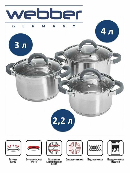 Набор посуды WEBBER BE-625/6, 6 предметов: 3 кастрюли, из нержавеющей стали со стеклянными крышками. Набор кастрюль из высококачественной нержавеющей стали со стеклянными крышками.
