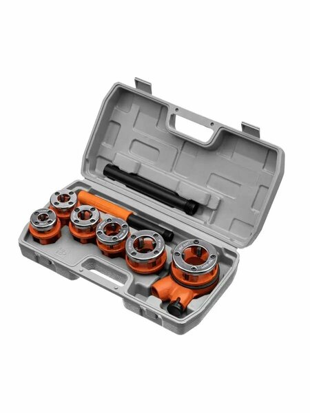 Набор Sparta 773355 включает в себя 9 предметов: клуппы наиболее востребованных размеров 1/4, 3/8, 1/2, 3/4, 1 и 1 1/4 дюйма, а также плашкодержатель с трещоткой и удлинителем. Пригодится частному мастеру для нарезания внешней резьбы на новых трубах или ремонта старых. Плашкодержатель оснащен трещоточным механизмом, который наиболее эффективно передает рабочее усилие, а также позволяет работать в труднодоступных местах. Преимущества Прочность — рабочая часть клуппов изготовлена из быстрорежущей стали 9XC. Высокий ресурс — конструкция клуппов предусматривает возможность замены резцов. Удобное хранение и транспортировка — набор поставляется в пластиковом боксе с ручкой.