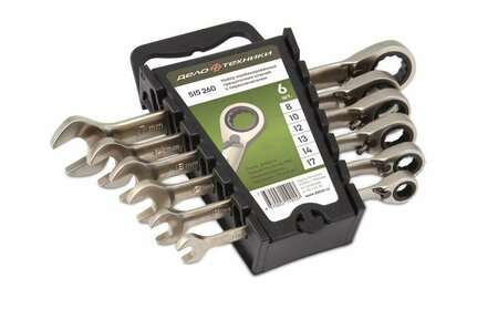 Набор комбинированных трещоточных ключей с переключателем. Комбинированный ключ из хромованадиевой стали с надёжным 72-зубцовым храповым механизмом в накидной части. Изменение направления вращения храповика у трещоточного ключа осуществляется рычажным переключателем в теле ключа. Накидная часть с храповым механизмом выполнена с отклонением 10º от продольной оси для удобства работы. Трещоточный ключ ускоряет отворачивание и заворачивание крепежа как в обычных условиях, так и в условиях ограниченного пространства. Обеспечивает высокий крутящий момент и минимальный угол возврата — 5º. Никелирование с защитным лаковым слоем обеспечивает дополнительную антикоррозионную стойкость ключа с трещоткой. Трещоточная часть ключа не предназначена для срыва и силовой протяжки крепежа, для этого применяется рожковый профиль ключа или торцевые головки. Состав набора: — ключи комбинированные трещоточные: 8, 10, 12, 13, 14, 17 мм; — холдер. Сталь: 6140CrV Твёрдость: 44 — 48 HRC Никелирование