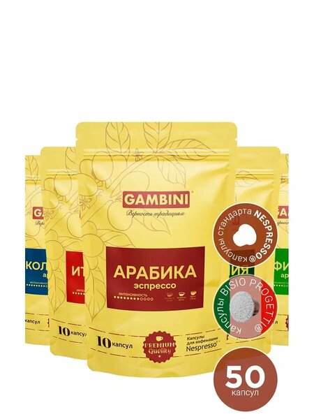 Это набор из 5 квусов со всего света, где каждый сорт уникален и по-своему интересен. Разнообразная гамма вкусов набора Gambini обеспечивается специально подобранным помолом и индивидуальной авторской обжаркой. Рекомендованный объем готового напитка-60 мл, капсулы подходят для системы Nespresso Original. Набор состоит из: Кофе в капсулах для Gambini Арабика-это высокогорная отборная Арабика из Колумбии, Гватемалы и Бразилии. Насыщенный и глубокий вкус кофе в капсулах nespresso. (1 упаковка-10 капсул). Бразилия Арабика с-в этом сорте арабики преобладают нотки жареных орехов и какао. И все это при небольшой кислотности делают Бразилию из этого региона такой популярной (1 упаковка-10 капсул). Колумбия Арабика для Неспрессо-эта 100% арабика из Колумбии обладает отчетливыми нотками какао, кислинкой зеленого яблока с легким оттенком карамели (1 упаковка-10 капсул). Эфиопия Арабика-во вкусе этого кофе в капсулах nespresso переплетаются сладкие цветочные оттенки и лимонная кислинка средней интенсивности. Добавьте к этому оттенки бергамота, и вы составите представление об этом незабываемом кофе (1 упаковка-10 капсул). Итальяно-высокогорная отборная Арабика из Индии и Бразилии с добавление высококачественной Робусты из Индии. Сбалансированный и насыщенный вкус кофе в капсулах nespresso (1 упаковка-10 капсул). Качество и вкус напитка капсульного кофе зависит не только от качества самого зерна. Важно создать правильный купаж из разных сортов кофе арабики и робусты, придать каждому из них свою степень обжарки. Еще одна важная составляющая- это помол. Только в совокупности всех этих факторов свежеобжаренный молотый кофе в капсулах будет идеальным по проливу и экстракции самого кофе. Именно поэтому специалисты нашей компанию проходили обучение и стажировку у признанных итальянских кофейных специалистов. Все вкусы и прочие нюансы также были тщательно проработаны совместно с гуру из Италии. Кофе в капсулах для кофеварки обладает сбалансированным вкусом и нежно хранит все вкусовые оттенки и аромат кофе для того, чтобы вы ежедневно могли наслаждаться своим любимым напитком. Наш капсульный продукт из разных стран мира поможет перенестись мысленно в свою кофейню к любимому баристе, приготовив чашку кофе на свой вкус-ароматный черный кофе американо, пробуждающий кофе эспрессо(espresso), воздушный кофе с молоком или сливками капучино, интенсивный кофе ристретто, бархатистый лунго, вкусный кофе с молоком латте. Капсулы для кофемашины-это очень удобный порционный вид кофе, который благодаря большому давлению в кофемашине, всегда обеспечит ваш напиток устойчивой плотной пенкой, или как ее называют итальянцы-крема (crema). Благодаря удобству и малым габаритам очень часто капсульные кофемашины дарят друг другу в подарок на всевозможные праздники. Состав: кофе натуральный жареный молотый в капсулах. Обжарка-средняя, помол-средний. Для приготовления правильного напитка используйте рекомендации, указанные на упаковке!