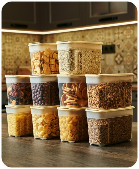 Набор контейнеров для сыпучих продуктов. Контейнеры для хранения производим из безопасного пищевого пластика, у него нет запаха. В кухонных контейнерах можно хранить крупы, макароны, муку, сахар и другие сыпучие продукты. В такие ёмкости для хранения можно насыпать сухофрукты, конфеты, орехи, чай, кофе, корм и лакомства для домашних животных. Банки для сыпучих продуктов можно мыть в посудомоечной машине. У пластикового контейнера есть крышка с клапаном. Это удобно, когда хотите насыпать не большое количество сахара или макарон в кастрюлю. Баночки для круп удобно держать в руке. У них эргономичная форма, есть углубления. Контейнеры для круп помогут навести порядок в шкафу. Поставьте их друг на друга. Контейнеры прозрачные – через них видно, что внутри. Легко достать то, что нужно. Крышка плотно закрывает контейнер и защищает продукты от насекомых. Пустые ёмкости для круп можно компактно сложить друг в друга. Так они займут мало места в шкафу. Пластиковые контейнеры для кухни помогут навести порядок, помогут дольше сохранить крупы и сыпучие продукты свежими. Их легко хранить и мыть. Они безопасны.