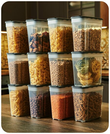 Набор контейнеров для сыпучих продуктов. Контейнеры для хранения производим из безопасного пищевого пластика, у него нет запаха. В кухонных контейнерах можно хранить крупы, макароны, муку, сахар и другие сыпучие продукты. В такие ёмкости для хранения можно насыпать сухофрукты, конфеты, орехи, чай, кофе, корм и лакомства для домашних животных. Банки для сыпучих продуктов можно мыть в посудомоечной машине. У пластикового контейнера есть крышка с клапаном. Это удобно, когда хотите насыпать не большое количество сахара или макарон в кастрюлю. Баночки для круп удобно держать в руке. У них эргономичная форма, есть углубления. Контейнеры для круп помогут навести порядок в шкафу. Поставьте их друг на друга. Контейнеры прозрачные – через них видно, что внутри. Легко достать то, что нужно. Крышка плотно закрывает контейнер и защищает продукты от насекомых. Пустые ёмкости для круп можно компактно сложить друг в друга. Так они займут мало места в шкафу. Пластиковые контейнеры для кухни помогут навести порядок, помогут дольше сохранить крупы и сыпучие продукты свежими. Их легко хранить и мыть. Они безопасны.