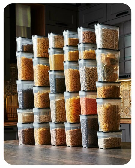 Набор контейнеров для сыпучих продуктов. Контейнеры для хранения производим из безопасного пищевого пластика, у него нет запаха. В кухонных контейнерах можно хранить крупы, макароны, муку, сахар и другие сыпучие продукты. В такие ёмкости для хранения можно насыпать сухофрукты, конфеты, орехи, чай, кофе, корм и лакомства для домашних животных. Банки для сыпучих продуктов можно мыть в посудомоечной машине. У пластикового контейнера есть крышка с клапаном. Это удобно, когда хотите насыпать не большое количество сахара или макарон в кастрюлю. Баночки для круп удобно держать в руке. У них эргономичная форма, есть углубления. Контейнеры для круп помогут навести порядок в шкафу. Поставьте их друг на друга. Контейнеры прозрачные – через них видно, что внутри. Легко достать то, что нужно. Крышка плотно закрывает контейнер и защищает продукты от насекомых. Пустые ёмкости для круп можно компактно сложить друг в друга. Так они займут мало места в шкафу. Пластиковые контейнеры для кухни помогут навести порядок, помогут дольше сохранить крупы и сыпучие продукты свежими. Их легко хранить и мыть. Они безопасны.