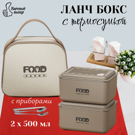 Набор контейнеров для еды / Ланч боксы с термосумкой и приборами, для СВЧ и морозильной камеры 500мл х 2 шт