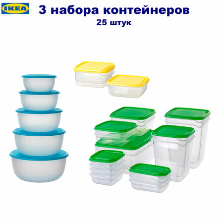 17 контейнеров ПРУТА зеленые квадратной и прямоугольной формы: 1,8л (23х16х8) - 2шт 1,6л (14х14х16) - 2шт 0,6л (14х14х6) - 2шт 1,0л (12х12х14) - 2шт 0,3л (12х12х4) - 2шт 0,15л(12х8х4) - 3 шт 0,15л(9х9х4) - 4 шт 3 контейнера ПРУТА желтые 14 x 14 x 6 см каждый 5 контейнеров РЕДА голубые: 0,2 л (диаметр 11см) 0,4 л (диаметр 13 см) 0,7 л (диаметр 15 см) 1 л (диаметр 17 см) 1,4 л (диаметр 19 см)