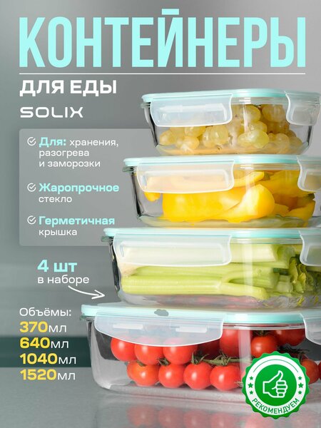 Удобные помощники в повседневной жизни - набор стеклянных контейнеров. Представьте себе: каждый из них станет надежным хранителем твоей еды! Термостойкая и прочная посуда SOLIX, поможет решить все задачи кухонного хозяйства. Все, что нужно - лишь выбрать правильный размер контейнера для каждого случая. В этом уникальном наборе ты найдешь несколько красивых и функциональных квадратных емкостей 520мл, 800мл, 1200мл. Они пригодятся в доме, на кухне, на работе или даже на учебе! Стильный голубой цвет крышек добавляет особенного шарма каждому контейнеру. Каждая плотно прилегающая пластиковая крышка оснащена специальным клапаном и защелками, что делает ее герметичной и надежной. Больше не нужно беспокоиться о пролитых продуктах в холодильнике или объемистых запахах из морозилки! Незаменимые емкости для свежих овощей, сочных фруктов и ароматных ягод. Они помогут сохранить вкус и аромат свежих продуктов, также как позволят им дольше оставаться свежими. Плотная резинка на крышке защитит продукты от доступа воздуха и препятствует проникновению поверхностной грязи и пыли. Эти контейнеры подходят для запекания, приготовления или хранения различных продуктов: мяса, рыбы, орехов, сухофруктов или перекуса для работы. Будь уверен, что твой завтрак, обед или ужин всегда будут готовы быстро и комфортно благодаря возможности использования контейнеров в микроволновке или духовке. И самое лучшее - после этого набор можно спокойно поместить в посудомойку! Такие универсальные наборы из стеклянных контейнеров SOLIX - это настоящая находка для всех заботливых хозяев. Великолепное сочетание прочности и эстетичности сделает твою работу в кухне еще приятнее. Набор стеклянных контейнеров SOLIX - это стильное, функциональное и надежное решение для хранения продуктов в доме или на работе.