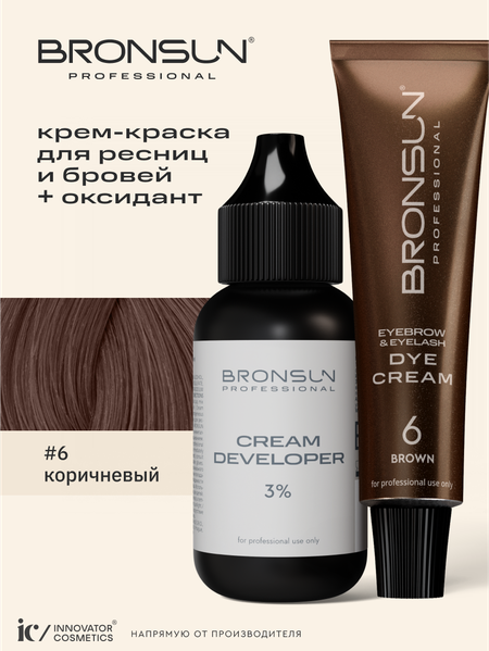 Крем-краска BRONSUN — теперь сразу в комплекте с оксидантом 3%! Краска BRONSUN — это инновационный продукт, представляющий собой высококачественную профессиональную косметику для домашнего и салонного использования. Она окрашивает не только волоски, но и кожу, обеспечивая выразительный и насыщенный результат. Краска обладает ухаживающей формулой, благодаря которой мягко воздействует на волосы и кожу, оставляя стойкий результат. BRONSUN — чемпион по стойкости: до 7 дней на коже и до 7 недель на волосках. Краска имеет насыщенную текстуру, которая обеспечивает комфорт при нанесении и удобство при смешивании с оксидантом, что важно для бровиста. Формула без аммиака гарантирует деликатное воздействие на волоски и сохранение здоровья. Краска не затемняет волоски, но обеспечивает насыщенное окрашивание кожи, что идеально для тонких, пористых и пересушенных волосков. Краска для бровей BRONSUN может применяться в ходе таких процедур, как: ламинирование бровей и ресниц, завивка, ботокс для ресниц, а также долговременная укладка бровей (счастье для бровей), чтобы сделать взгляд более выразительным. Ассортимент включает 7 цветов краски: черная, иссиня-черная, графит, коричневая, светло-коричневая, темно-коричневая и каштановая. Эти оттенки можно использовать в чистом виде или смешивать, подчеркивая индивидуальный стиль. Коричневый #6 – выразительный цвет с нейтральным, ближе к теплому, подтоном, на оранжевой основе. Имеет высокую интенсивность окрашивания кожи и волосков. Станет лучшим выбором для девушек с пепельно-русым, темно-русым цветом волос. Уровень глубины тона – 4. Каждая партия продукции проходит тщательное тестирование, обеспечивая высокий стандарт качества. Профессиональная косметика BRONSUN от Инноватор Косметикс - ваш выбор для ухода за бровями и ресницами.