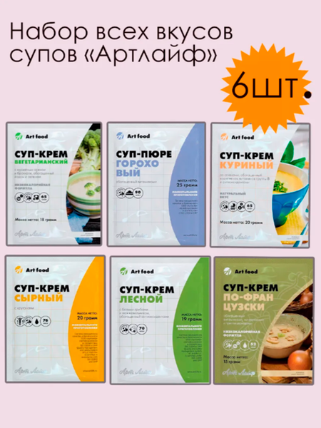 Набор из 6 вкусов супов Артлайф — это идеальное решение для тех, кто хочет разнообразить свой рацион и насладиться вкусными и полезными блюдами. В набор входят супы с различными вкусами: куриный, грибной, овощной, гороховый, борщ и солянка. Каждый суп Артлайф приготовлен из натуральных ингредиентов, без искусственных красителей, ароматизаторов и консервантов. В состав входят овощи, мясо, грибы и специи, которые придают блюдам насыщенный вкус и аромат. Супы Артлайф богаты витаминами и минералами, необходимыми для поддержания здоровья организма. Они способствуют укреплению иммунитета, поддержанию нормального функционирования сердечно-сосудистой системы, улучшению пищеварения и обмена веществ. Набор из 6 вкусов супов Артлайф станет отличным подарком для друзей и близких, которые заботятся о своём здоровье и хотят наслаждаться вкусной и полезной едой. В набор входит суп-пюре: вегатерианский, куриный со сливками, лесной, по-французски, сырный и гороховый. Способ приготовления содержимое пакета залить 180-200 мл кипятка, тщательно размешать. Продукт готов к употреблению.