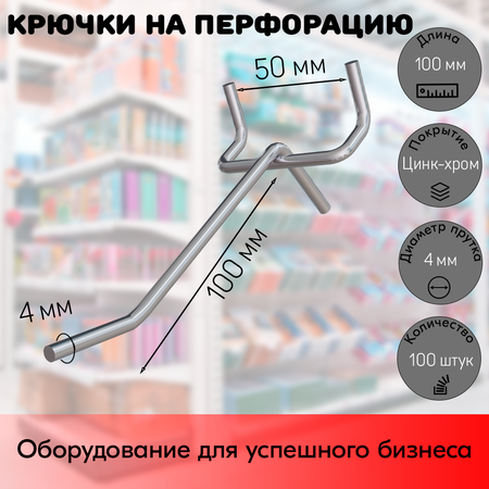 Набор Крючок 100 мм для перфорации одинарный, цинк-хром, шаг 50, диаметр прутка 4 мм - 100 шт Состав набора: - Крючок для перфорации одинарный 100мм, цинк-хром, d4, шаг 50, BUDGET - 100 шт Крючки для стеллажей длиной 100 мм, одинарные для перфорации, с шагом 50 мм, диаметр крючка 4 мм Как правило, крючки для перфорации используются в магазинах и супермаркетах для удобного размещения мелкой продукции с сферах электроники, канцелярии, косметики, автомобильного и бытового инструмента и других.