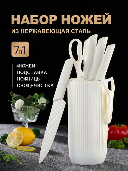 Набор ножей кухонных с подставкой включает нож топорик, нож поварской , нож для нарезки, нож универсальный , нож для чистки овощей , овощечистка, ножницы , подставка. Набор кухонных ножей и подставка позволяют держать ножи в порядке и экономить место.