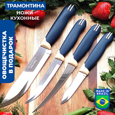 Набор кухонных ножей Tramontina представляет собой высококачественные изделия с легендарным качеством по доступной цене. Лезвия и рукоятки изготовлены из первоклассных материалов и произведены в Бразилии. Они острые, не требуют частой заточки, долговечны и приносят удовольствие в процессе готовки. Попробовав профессиональные ножи кухонные этого бразильского бренда, вы, возможно, больше не захотите покупать другие "немецкие" или "японские" бренды. Трамонтина - лучший вариант по соотношению цена и качество! Этот производитель известен в России с 1990-х годов и набирает все большую популярность. Отзывы о нас говорят сами за себя. Набор ножей включает в себя шеф-нож длиной 27 см, с зубчиками с лезвием 13 см, универсальный с прямым лезвием 13 см и нож для овощей и фруктов. Поварская тройка и знаменитый фирменный нож с зубчиками, помогут решить любые задачи на вашей кухне. Кроме того, Вас ждет приятный подарок - овощечистка-пиллер. Порадуйте себя и ваших близких, подарив им товары Tramontina - отличный выбор для любого кулинара.