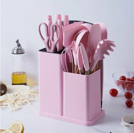 Щипцы кухонные, лопатка кондитерская и лопаточка с отверстиями для жарки на сковороде, ложка для спагетти, ложка для салата, ложка для выпечки, шпатель, половник, шумовка, венчик для взбивания, кисточка для масла, 5 ножей разного размера, разделочная доска и подставка для хранения приборов.