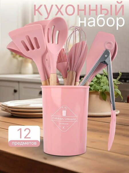 Набор кухонных принадлежностей из силикона и бамбука из 12 предметов и стакан для хранения "Kitchen set" Набор силиконовой посуды-кухонный помощник, идеально подходит для всех видов продуктов и кухонных принадлежностей, жарки, перемешивания крема, масла, мороженого и т. д. Включает лопатку, щётку для протирания, шпатель с острым носком, Тернер с круглыми краями, ковш, токарь с прямыми краями, ложку, щипцы, Паста вилка и идеально подходит для всех типов продуктов и приготовления пищи. Набор кухонных принадлежностей Премиум класса из бамбука и силикона с подставкой + подарок Подложка. Кухонный набор включает в себя 12 предметов для любого случая: половник, лопатка 2 вида, ложка для салата 2 вида, ложка для спагетти, шпатель, щипцы, кисточка для масла, лопатка для замеса теста, венчик. В кухонный набор так же входит удобная пластиковая подставка для приборов с отверстием для слива воды. Силиконовая рабочая часть приборов не оставляет царапин на поверхности тефлоновой и керамической посуды. Высококачественный силикон выдерживает температуру до +230 градусов. Набор кухонных принадлежностей дополнен подложкой, а это значит что Ваши рабочие поверхности останутся чистыми в процессе приготовления вкусной еды. Бамбуковая ручка оснащена отверстием для подвешивания. Уход за аксессуарами для кухни: кухонные принадлежности не рекомендуется мыть в посудомоечной машине! Особенности: Защита окружающей среды, нетоксичный, термостойкий, антипригарный, прочный, безопасный, легко чистится продукты для кухонной посуды Подходит: микроволновая печь, тостер, пароварка, можно варить и стерилизовать. Материал: силикон + дерево из натуральной акации Цвета: Кратко о товаре: Высококачественный силикон и бамбук Длина кухонных предметов от 24,8 до 31,8 см Комплектация: подставка; половник; венчик; щипцы; шпатель; ложка для салата - 2 шт; ложка для спагетти; лопатка для замеса теста; кисточка для смазывания; лопатки - 2 шт, подарок-подложка Уход за аксессуарами для кухни: кухонные принадлежности не рекомендуется мыть в посудомоечной машине! Характеристики: Дополнительная информация Длина упаковки: 15 см Ширина упаковки: 15 см Высота упаковки: 33 см Страна производства: Китай Материал посуды: Пластик + силикон; Дерево (бамбук) Назначение посуды: Для кухни , для дома; Кухонный набор для приготовления пищи Назначение подарка: Маме Бабушке Жене Подруге Сестре Дочке Женщине; Маме Девушке Жене Подруге Сестре Дочке Комплектация: 1 набор из 12 предметов Общие характеристики Количество предметов в упаковке: 12; 12 (1 подставка для хранения, 11