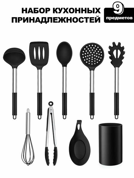 Подставка из пластика; ложка для спагетти; половник; силиконовая кухонная лопатка; ложка для салата; шумовка; щипцы; кисточка для масла; подставка для приборов.