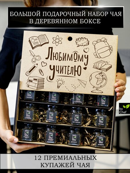 Шеф приготовил вкусные подарки к любому поводу - премиальные купажи в элитном деревянном боксе с гравировкой. Внутри вы найдете ароматную чайную коллекцию из 12 банок, которые понравятся каждому: дедушке, бабушке, подруге, сестренке, любимой женщине и мужчине. Ассорти содержит Китайские, Вьетнамские, Индийские классические крупнолистовые сорта, а также с фруктовыми, ягодными и цветочными добавками. Обладает полезными детокс свойствами. Независимо от того, кому вы хотите сделать презент - мужу, жене, сестре, девушке он обязательно порадует их своим неповторимым вкусом, видом и ароматом. Это не только напиток, но и символ заботы и внимания на 23 февраля, день учителя, день воспитателя, 8 марта, выпускной, день матери, юбилей , на новогодние праздники и ко дню рождения. Объем баночек 100мл. Вес чая в наборе ~315гр.
