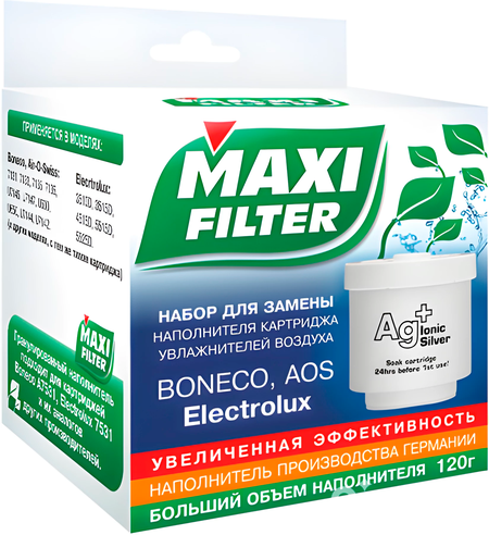 Наполнитель MAXI FILTER изготовлен из высококачественной ионообменной смолы, которая обеспечивает деминерализацию испаряемой воды и продлевает срок службы картриджа. В комплект набора входят: - Наполнитель – ионообменная смола (120 г); - Стакан для удобства использования; - Пробка для герметичного хранения наполнителя. Набор MAXI FILTER совместим с увлажнителями воздуха BONECO, Air-O-Swiss, Electrolux, AEG и другими, имеющими картриджи типа 7531. Выбирая набор MAXI FILTER, вы получаете качественный продукт, который обеспечит эффективную работу вашего увлажнителя и продлит его срок службы.