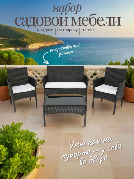 Набор мебели "Доминика" арт. SFS003 от бренда "Garden story" представляет собой комплект садовой мебели, состоящий из стола, двух кресел и дивана. Мебель изготовлена из высококачественных материалов, включая металл, искусственный ротанг и водоотталкивающую ткань. Каркас мебели выполнен из стали, что обеспечивает его устойчивость к влаге и долговечность. Габариты элементов набора мебели "Доминика" составляют: стол - 710х400х490 мм, кресло - 630х600х810 мм, диван - 1120х600х810 мм. Цвет каркаса мебели - темно-коричневый, а цвет чехла мягкого элемента/матраса - серый. Узор ткани чехла без рисунка, что придает мебели современный и стильный вид. Особенностью набора мебели "Доминика" является его устойчивость к влаге, что позволяет использовать его на открытых площадках, террасах и в зонах отдыха у воды. В комплект входят стол, два кресла и диван, рассчитанные на размещение четырех человек. Производство набора мебели "Доминика" осуществляется в Китае, что гарантирует высокое качество и соответствие международным стандартам.