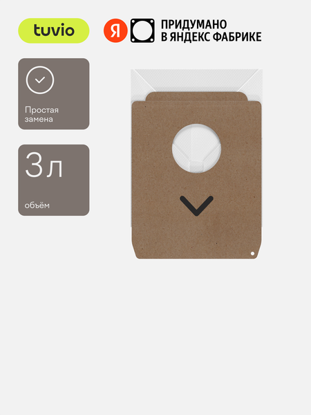 Tuvio — это бренд удобной бытовой техники, придуманный в Яндексе. Набор мешков для сбора пыли DBTS04 подходит для станции самоочистки беспроводного вертикального пылесоса Tuvio TVC04S. В комплекте — 5 одноразовых мешков из экологически чистой двухслойной бумаги: они прочные и безопасные в использовании. Объём каждого мешка — 3 л, этого достаточно для нескольких полноценных еженедельных уборок. Легко снимаются и устанавливаются вручную. Мешки важно менять по мере заполнения, чтобы уборка была качественной, а пылесос работал стабильно и долго. В Tuvio можно купить оригинальные сменные комплектующие для ухода за устройствами.