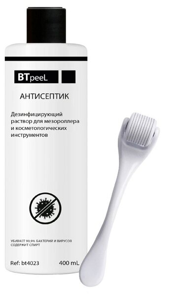 Готовое к применению спиртовое антибактериальное дезинфицирующее средство для применения в косметологических, маникюрных кабинетах и домашнего использования + Мезороллер BTpeel, 540 игл 0,5мм . Раствор может применяться для всех видов мезороллеров и дермапенов, косметологических инструментов, инструментов для маникюра и педикюра. Применяется для обработки рук, поверхностей, инструментов. Обладает мощным бактерицидным и дезинфицирующим воздействием. Дез раствор полностью готов к применению. Необходимо отлить необходимое количество раствора в отдельную емкость и погрузить используемые инструменты или металлическую часть мезороллера на 1 минуту. После чего инструменты вынуть, просушить и убрать на хранение. Дез раствор может применяться для кожи. Для этого кожу протирают ватным тампоном, обильно смоченным в растворе или просто омывают раствором. Время выдержки после обработки кожи 20 секунд. Смывать раствор не нужно. Убивает 99,9% бактерий и вирусов. Содержит спирт.