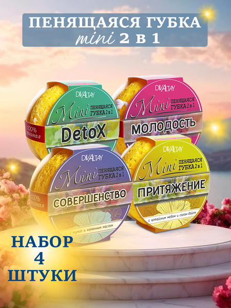 Набор мини-губок для тела 2 в 1 с мылом от DIVALTAY - это высококачественный продукт ручной работы, созданный на основе экологически чистых ингредиентов с Алтая. В комплект входят 4 губки разных цветов и ароматов, каждая из которых обладает своим уникальным эффектом. Губки изготовлены из поролона, что обеспечивает их мягкость и комфорт при использовании. Комбинированная жесткость позволяет обеспечить эффективное очищение и тонизирование кожи, а также увлажнение и питание. Каждый продукт из набора имеет свой уникальный состав. Губка "Detox" содержит кедровое масло, витамин Е, белую глину и экстракты трав, таких как мята, мелисса и чистотел. Губка "Молодость" обогащена маслом зародышей пшеницы, пантогематогеном и экстрактами трав, включая красную щетку, смородину и календулу. Губка "Совершенство" содержит каменное масло, мумие и экстракты трав, включая череду, золотой корень и календулу. Губка "Притяжение" обогащена медом, маслом виноградной косточки и экстрактами трав, включая саган-дайля, ромашку и череду. Особенностью губок является наличие мыла внутри. Это делает процесс принятия душа еще более приятным и удобным, так как теперь нет необходимости использовать гели для душа. Достаточно намочить губку водой, и она тут же начнет пениться, создавая обильную пену и приятный аромат. При использовании губок создается эффект мягкого пилинга, благодаря чему кожа после душа будет обновленной, отдохнувшей, увлажненной и нежной. Набор мини-губок для тела 2 в 1 с мылом от DIVALTAY станет отличным подарком для мужчин и женщин на любой праздник, будь то Новый год, Рождество, День Святого Валентина, 23 февраля, 8 Марта или День Рождения.