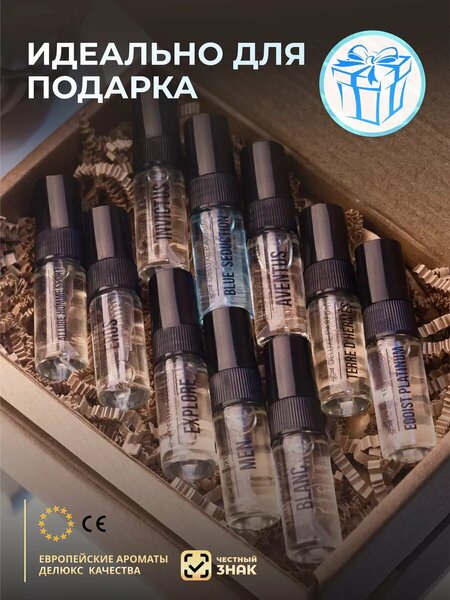 Набор мужских пробников духов - идеальный способ познакомиться с разнообразием ароматов и выбрать свой идеальный запах без больших затрат на каждый день Микс популярных мужских парфюмов от всемирно известных брендов, которые помогут вам подчеркнуть свою индивидуальность и стиль. Набор создан по мотивам таких ароматов как Eros от Versace, Terre d'Hermès от Hermès, Allure homme Sport и Egoist platinum от Chanel, Aventus от Creed, Blue Seduction от Antonio Banderas, Invictus от Paco Rabannе, Blanc от Lacoste, Man от Calvin Klein, Explore от Montblanc и 100% соответствует оригиналу. Eros от Versace — для страстно эмоционального мужчины, с восточно-древесными нотками, зеленым яблоком, мятой, цитрусовой горечью герани и ванили. Terre d'Hermès от Hermès — яркий аромат для сильных и решительных мужчин, символ утонченного вкуса и аристократизма. Allure homme Sport от Chanel — приятный древесно-пряный аромат для тех, кто хочет достигать новых высот и побед. Egoist platinum от Chanel — свежий чувственный аромат элегантного и уверенного в себе мужчины. Aventus от Creed — со свежим и легким ароматом, цветочно-фруктовыми оттенки и богатой древесной палитрой для стильных и модных. Blue Seduction от Antonio Banderas — насыщенный и дерзкий. Удовлетворит самый изысканный вкус, открываясь черной смородиной, мятой, дыней с морской водой и зеленым яблоком. Invictus от Paco Rabannе — поистине неподражаемый парфюм семейства фужерных и водных ароматов Blanc от Lacoste классический и чувственный аромат для мужчин, который до сих пор остается одним из самых популярных мужских парфюмов. Man от Calvin Klein — является предметом гордости известного бренда. Получил громкую славу и необычайную популярность. Explore от Montblanc — это безупречная и исключительная композиция, которая понравиться любому. Каждый мужской одеколон в нашем наборе масляных духов отличается высоким качеством и оригинальным стойким ароматом, что делает его идеальным подарком на 14 февраля как для подростков, так и для взрослых мужчин