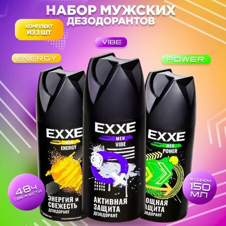 Набор дезодорантов мужских спрей EXXE «Vibe», «Power» и «Energy», 150 мл. Мягкая и при этом мощная формула дезодоранта EXXE MEN мужской дезодорант «Vibe», «Power» и «Energy», 150 мл (аэрозоль) эффективно устраняет запах пота и не раздражает кожу. Не оставляет следов на одежде. Спрей EXXE препятствует размножению бактерий и позволяет коже дышать. Дезодорант Экс создан для мужчин, которые ценят свое время и стремятся всегда выглядеть безупречно. Средство быстро высыхает. В составе отсутствуют соли алюминия, поэтому дезодорант не оказывает токсичного влияния на эпидермис и не блокирует работу потовых желез.