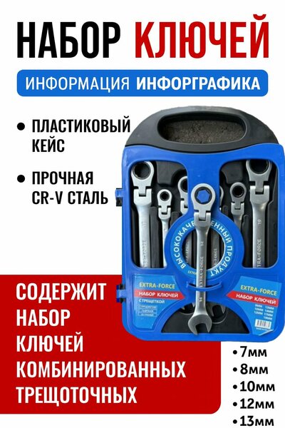 Главное преимущество данного набора - трещоточный механизм, позволяющий значительно упростить и ускорить работу. В отличие от обычных ключей, накидные ключи с трещоткой обеспечивают более точный и безопасный захват гаек и болтов, минимизируя риск повреждения крепежных элементов. В наборе представлены ключи пяти различных размеров, что позволяет работать с крепежами разных типоразмеров. Благодаря этому вы можете использовать его как в бытовых условиях, так и на профессиональных строительных площадках. Высокопрочный материал, из которого изготовлены ключи, обеспечивает долгий срок службы и устойчивость к износу. Специальный дизайн накидных ключей с трещоткой обеспечивает легкость использования даже в труднодоступных местах. Эргономичная рукоятка позволяет снизить нагрузку на кисти рук, что делает процесс работы комфортнее и эффективнее. Данный набор ключей идеально подходит для монтажных и демонтажных работ, будь то ремонт автомобиля, сборка мебели или сантехнические работы. Он также станет отличным выбором для профессиональных строителей и механиков, которым важно иметь качественный и надежный инструмент. Если вы ищете надежный и многофункциональный набор инструментов, то наш набор накидных ключей с трещоткой точно оправдает ваши ожидания.