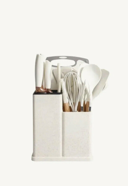 Достоинства:креативно,качественно, Недостатки:на разделочной доске пятно ,не оттирается ничем. Комментарий:Вопрос продавцу,чем же отмыть пятно на разделочной доске?в целом понравилось,отличный набор,всё необходимое что необходимо на кухне.лезвие ножей острое,Удобная подставка,пластмассовая,но прочная.разделочная доска тоже пластмасса,не гладкая,матовая.Утварь силиконовая упругая,а ручка из дерева,гладкая.Решили проверить покрытие на ножах,поточили точилкой ручной для ножей и камнем точильным,к нашему удивлению на покрытие ни царапинки.посмотрим что будет после многократного применения.Заказывала розовый под гарнитур кухонный,набор хорошо вписался в интерьер.у меня на фото цвет немного искаженный,так он немного ярче,красиво смотрится.