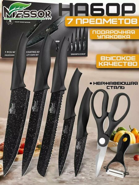 Набор из 5 ножей в комплекте с ножницами и овощечисткой- лучшее решение для вашей кухни. Профессиональный подарочный комплект кухонных принадлежностей в виде прочных ножей из нержавейки с антикоррозийным покрытием поможет создать настоящий кулинарный шедевр. Нержавеющая высококачественная сталь. Мраморное покрытие. Острая заточка. Комплект качественных ножей станет великолепным подарком к любому празднику для любителей кулинарных экспериментов. Ножи идеально подойдут к стильным и современным кухням: выбор истинных эстетов и профессионалов. Благодаря высокой плотности и твердости металла, поверхность лезвия не царапается и долго сохраняет безупречный внешний вид. Острое лезвие ножей позволяет легко и быстро резать разные виды продуктов, не прикладывая много усилий. Нескользящая рукоятка удобной формы гарантирует надежный хват и комфорт использования ножа. Прочный материал ручки способствует длительному использованию изделия.