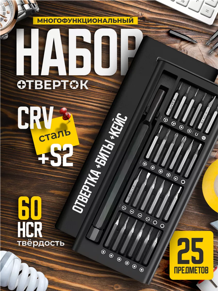 Набор отверток 24 в 1 однозначно пригодится в хозяйстве любому человеку и позволит ремонтировать практически все устройства и предметы. Каждая бита промаркирована, имеет соответствующее схематическое изображение на кейсе. Кейс сделан из алюминия – имеет красивый дизайн с закругленными краями, с магнитным фиксатором. Набор плотно зафиксирован в кейсе. Вынимается по нажатию. Все компоненты стойкие к коррозии. В наборе имеются плоские, пятиконечные, звездообразные, крестообразные и треугольные насадки. Купите набор один раз, и вам хватит его для ремонта компьютеров, телефонов, камер, часов и многих других устройств. Набор хранится в компактном кейсе, который легко брать с собой в поездки или хранить в машине. Качественный материал, из которого изготовлены насадки, гарантирует долговечность. Кроме того, набор весит совсем мало, поэтому его удобно использовать. Комплектация PH2; PH1; PH0; PH00; PH000; Y1; P5; P2; SL4.0; SL3.0; SL2.0; SL1.5; TORX T8H; TORX T6H; TORX T5H; TORX T8H; TORX T4; TORX T3; TORX T2; 2.3; U2.6; H2.0; H1.5; TORX T15H; TORX T10H.