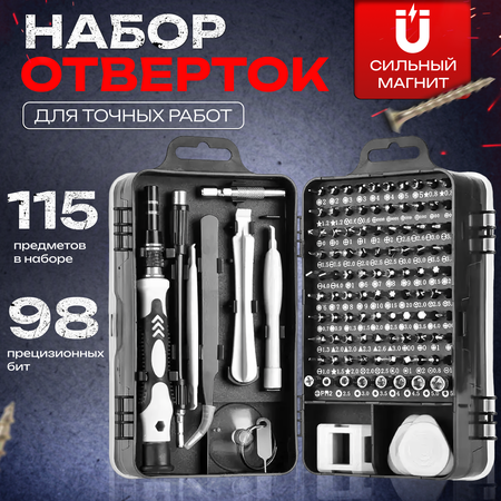 Набор отверток и бит 115 в 1: многофункциональный и точный Большой набор отверток и бит 115 в 1 для точных работ Набор отверток и бит 115 в 1 от KocKross предназначен для выполнения точных работ в электронике и электромеханике. Включает в себя все необходимые отвертки для работы в доме и ремонта электронной техники, включая телефоны, часы, планшеты и другие устройства. Удобная ручка и гибкий удлинитель Удобная ручка с реверсивным механизмом и фиксацией обеспечивает надежное и удобное использование. Гибкий удлинитель позволяет добраться до труднодоступных мест. Надежное магнитное крепление и долговечность Магнитное крепление биты в держателе отвертки и магнитные биты делают использование инструмента удобным и точным. Все биты изготовлены из хромованадиевой стали, устойчивой к стиранию, окислению и коррозии. Набор надежно фиксируется в компактном кейсе-органайзере, каждый элемент в своем слоте. Набор отверток и бит 115 в 1 станет отличным подарком для любого, кто занимается ремонтом техники или просто любит возиться с мелкими деталями. Комплектация: В набор отверток входят: - удобная рукоятка-держатель с вращающейся опорной пяткой - гибкий удлинитель - жесткий удлинитель - переходники - пинцет - устройство для извлечения sim-карт - пластиковые открыватели - присоска - устройство для намагничивания/размагничивания инструмента - 98 прецизионных бит всех основных типов: PH0000, PH000, PH00, PH0, PH1, PH2, PZ000, PZ00, PZ0, PZ1, PZ2, SQ0, SQ1, SQ2, G3.8, G4.5, SL1.0, SL1.3, SL1.5, SL2.0, SL2.5, SL3.0, SL3.5, SL4.0, M2.5, M3.0, M3.5, M4.0, M4.5, M5.0, M5.5, P2(0.8), P5(1.2), P6(1.5), P8(2.0), T1, T2, T3, T4, T5, T6, T7, T8, T9, T10, T15, T20, H0.7, H0.9, H1.0, H1.3, H1.5, H2.0, H2.5, H3.0, H3.5, H4.0, H4.5, H5.0, H6.0, T6H, T7H, T8H, T9H, T10H, T15H, T20H, T25H, Y0.6, Y1.5, Y2.0, Y2.3, Y3.0, U2.3, U2.6, U8, W2.0, SIM0.8, PH2.